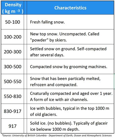 In more scientific terms, snow density can be defined as the amount or mass of ice and liquid water per volume. You shouldn't worry too much about the liquid water part because there is usually a LOT more ice than liquid water in the snowpack. However, in the spring, liquid water content can be more significant. Snow density measurements are usually not divided into ice and liquid water components though, and it is the total (= frozen water + liquid water) density that we are concerned with here anyway. Source: University of British Columbia - Department of Earth, Ocean and Atmospheric Sciences. Learn More Here
